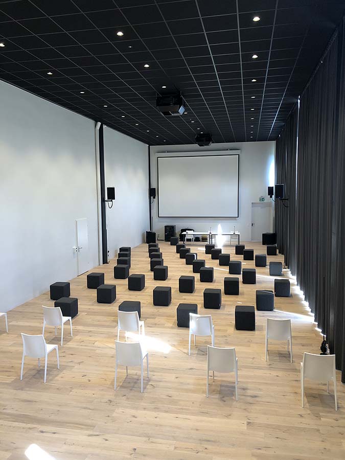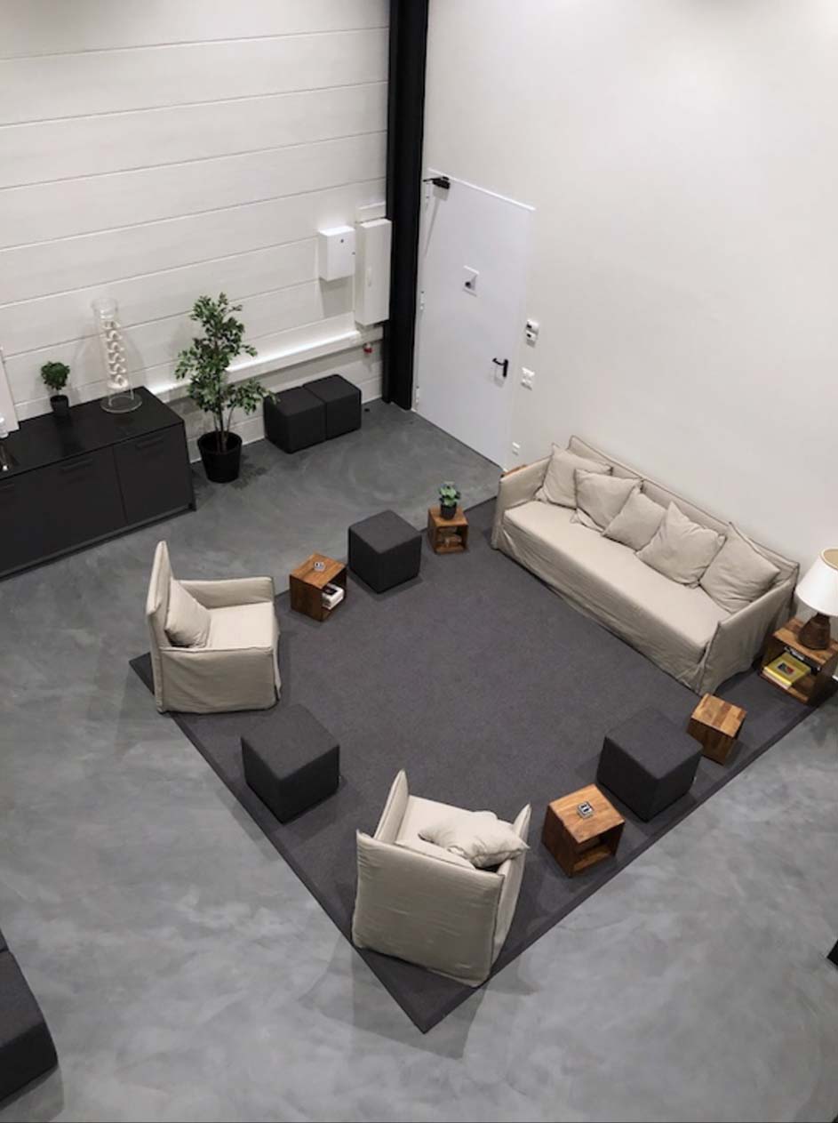 Anticamera e zona social Entrando in Area 302 si accede a un’anticamera di più di 30 mq, dove gli Ospiti possono depositare giacche e scarpe (tutti i locali sono “no-shoes”), in cui ci sono due Yantra, uno giallo, che stimola la concentrazione attiva, la gioiosità e la creatività interiore, e uno blu, che evoca calma e stabilità interiori. L’anticamera apre su un’ampia “zona social” a tutt’altezza, di più di 40 mq (the cube), un luogo di relax e di condivisione, dotato di un comodo divano, poltrone e pouf, dove c’è anche una “power tower”, a disposizione degli Ospiti che desiderano tenersi in forma.